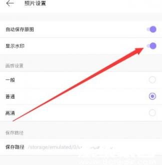 3、在二级设置面板中,可见到水印显示功能开关。该控件默认处于启用状态,向左滑动即可关闭此功能。建议操作完成后返回拍摄界面进行效果验证