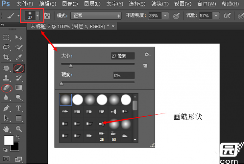 4、进阶用户可通过属性栏的扩展菜单进行深度定制。点击工具选项栏末端的展开箭头,可调出包含散布、纹理、动态形状等二十余项专业参数的设置面板。这里建议新手保持角度抖动和传递选项的默认状态,待熟悉基础操作后再进行复杂设置。