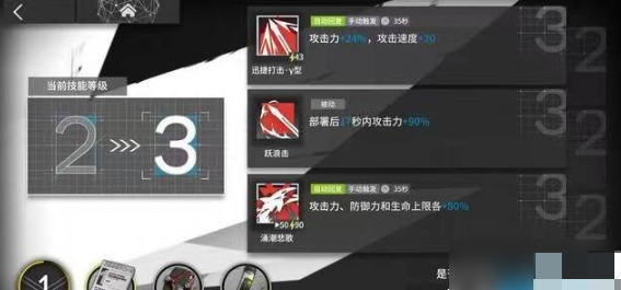 三技能"涌潮悲歌"开启后带来夸张的180%攻击加成,配合快速再部署机制形成独特的战斗循环:技能爆发期结束后主动撤退,通过部署冷却缩减实现高频次战场切入。这种特性使其在应对高威胁单体目标时展现不可替代性,尤其在剿灭作战与突袭关卡中能有效破解高压波次。