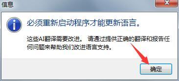 3、点击对话框右下角"确定"按钮保存设置变更,系统将自动弹出重启提示窗口,需完全退出当前运行程序;